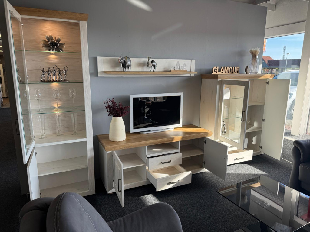 Schöne Wohnwandkombination Pinie Aurelio/ Grandson Oak Brixen. 2x Vitrine / TV-Element / Regalca. 369cm x 210cm x 52cm Inkl. Beleuchtung und Spots.Lieferung und Montage auf Anfrage gegen Aufpreis möglich.Ohne Deko