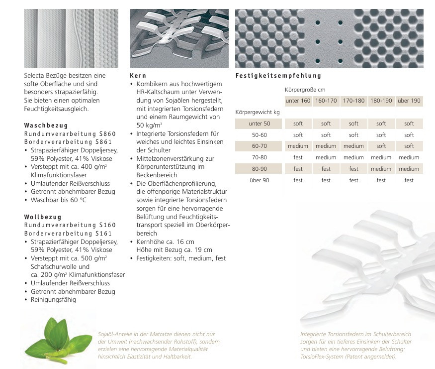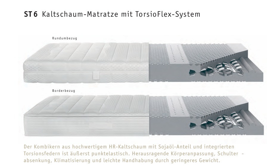 Kaltschaum-Kern mit Sojaöl-Anteil und integrierten Torsions federn für ausgesprochene Punktelastizität und hohen Liegekomfort