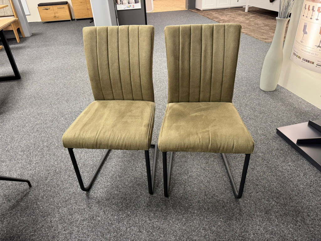 Design Carva exklusiv 4x Schwingstühle mit Pfeiffensteppung Rundrohr schwarz, Microfaser grün.1x Armlehnstühle Carva mit Nosagfederung in Microfaser grün.Lieferung auf Anfrage gegen Aufpreis möglich.
