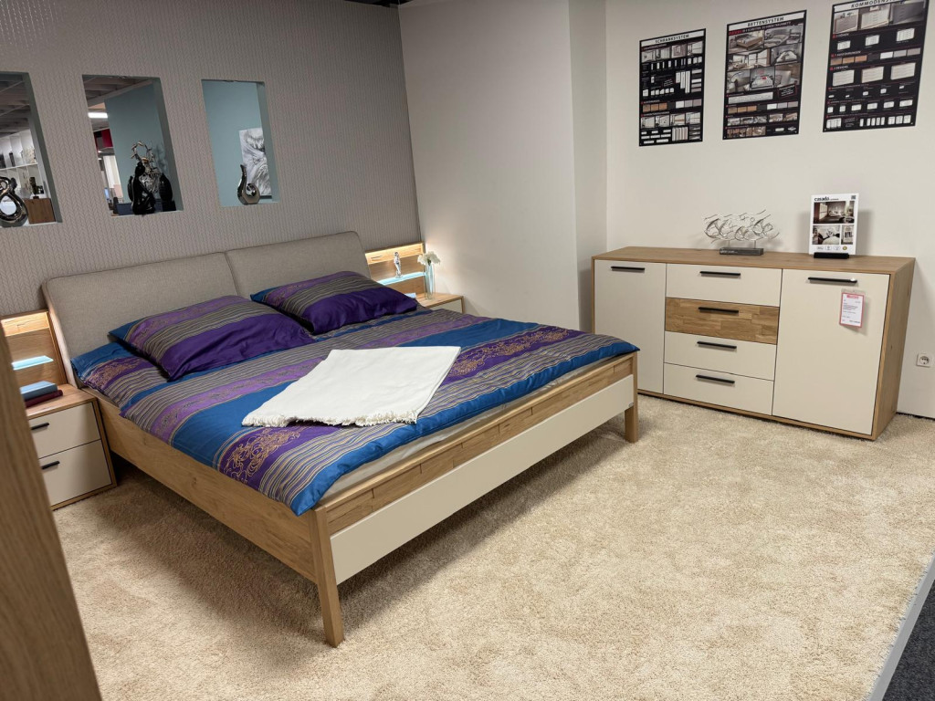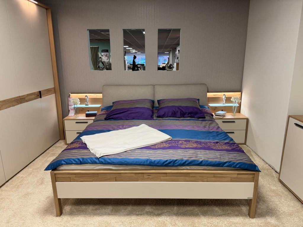Hochwertige Schlafraumeinrichtung Lack Sand/Balkeneiche mit Bauchbinde Spaltholz Style