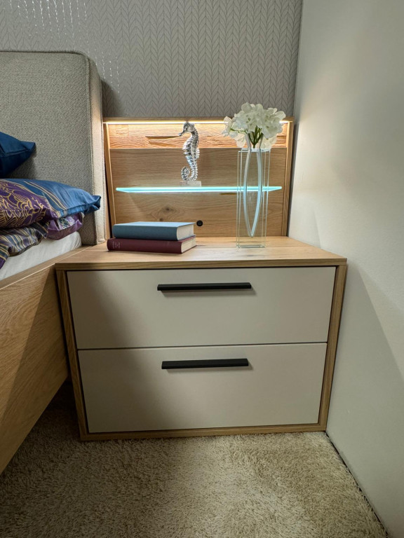 2x Nachtkonsole 64cm inklusive 2x Paneelaufsatz Ablage Glas satiniert, 2x indirekte Beleuchtung für Paneelaufsatz, 2x LED Beleuchtung für Glasboden