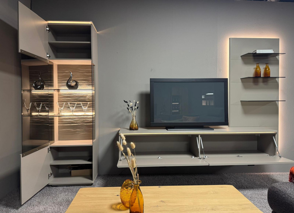 Schöne Wohnwandkombination Basalt Lacklaminat Torrent.Vitrine / TV-Element / Regal ca. 295cm x 201cm x 44cmInkl. Beleuchtung und Funkfernbedienung.Lieferung und Montage auf Anfrage gegen Aufpreis möglich.Ohne Deko